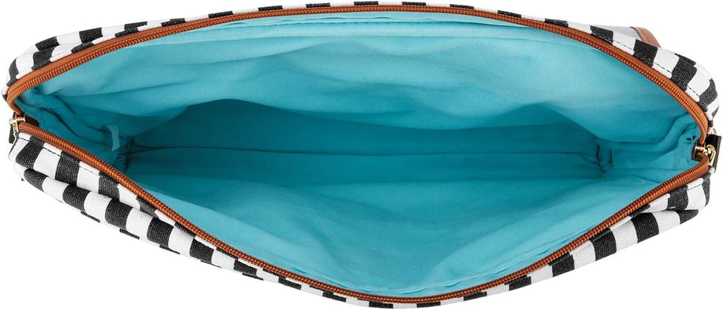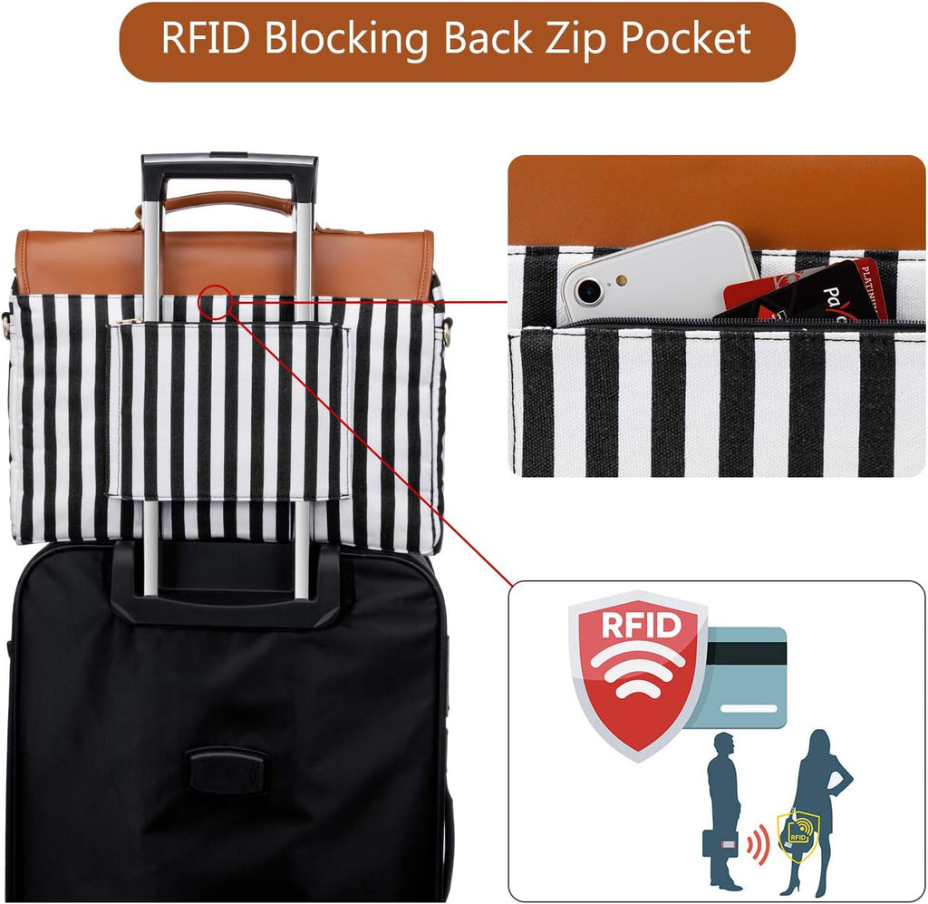 The back pocket of 15.6 inch Laptop bag for women with advanced RFID security technology, unique metal composites, designed specifically to block RFID signals up to 13.56 MHz or higher, and protect your valuable information such as passport, credit cards, debit & ATM cards, driver's licenses. No more worries about data theft by RFID scanners.