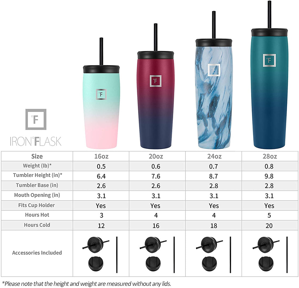 NOMAD TUMBLER: Goodbye sweat! The double wall insulation makes the Iron Flask Tumbler sweat-free! It keeps your drink COLD for up to 20 hours, and HOT for up to 5 hours (depending on size). Our tumblers fit in most standard cup holders.