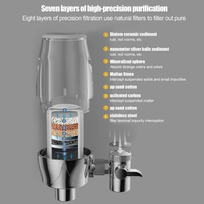 1.Enhanced Water Purity: With multiple filters working together, this faucet water filter ensures clearer and sweeter water by rapidly getting rid of impurities and resichlorine, providing you with the purest and healthiest drinking water.